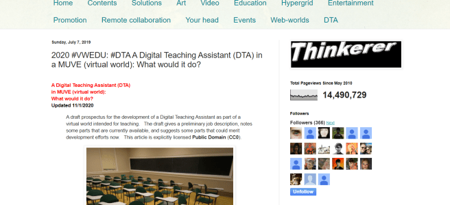 Transcript of the Virtual Worlds Education Roundtable: July 11, 2019 Topic: A Digital Teaching Assistant (DTA) in MUVE (virtual world): What would it do? https://virtualoutworlding.blogspot.com/2019/07/2019-vwedu-digital-teaching-assistant.html Competitive sports for online schools. Robotics, search-masters, DTA-Turing challengeshttps://virtualoutworlding.blogspot.com/2019/06/2019-vwedu-competitive-sports-for.html ThinkererSelby Evans (thinkerer.melville): let's start now -- I will put some things in text. A draft prospectus for the development of … Continue reading July 11, 2019: A Digital Teaching Assistant (DTA) in MUVE (virtual world): What would it do?